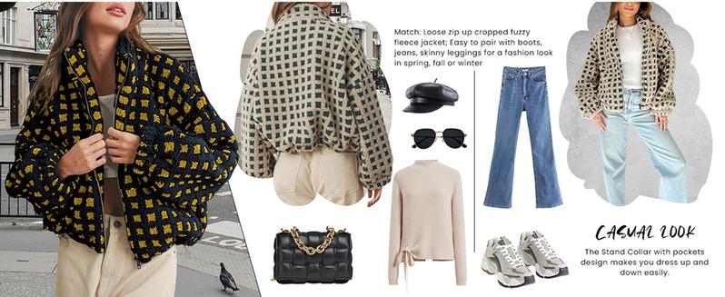 - This trendy stand collar checkered winter coat for women fits for casual daily wear, school, going out, date, vacation and work, stay you away from the cold outdoors, a perfect addition to your closet, women oversized checkerboard fuzzy fleece shearling jacket